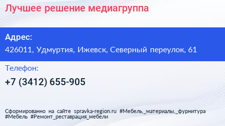 Для связи с организацией воспользуйтесь номером телефона: +7 (3412) 655-905. Пн: c 09:00-18:00, Вт: c 09:00-18:00, Ср: c 09:00-18:00, Чт: c 09:00-18:00, Пт: c 09:00-18:00, Сб: выходной, Вс: выходной, вы можете обратиться в эту организацию.