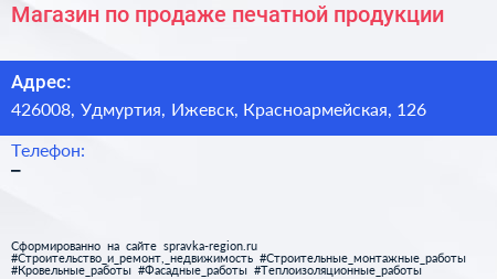 Магазин по продаже печатной продукции по адресу 426008, Удмуртия, Ижевск, Красноармейская, 126 в дальнейшем Организация, размещена в следующих категориях: