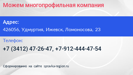 Можем!, многопрофильная компания по адресу 426056, Удмуртия, Ижевск, Ломоносова, 23 в дальнейшем Организация, размещена в следующих категориях: