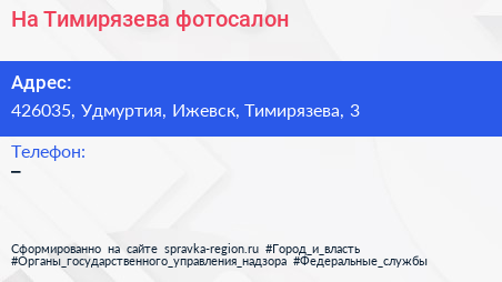 На Тимирязева, фотосалон по адресу 426035, Удмуртия, Ижевск, Тимирязева, 3 в дальнейшем Организация, размещена в следующих категориях: