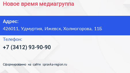 Новое время, медиагруппа по адресу 426011, Удмуртия, Ижевск, Холмогорова, 11Б в дальнейшем Организация, размещена в следующих категориях: