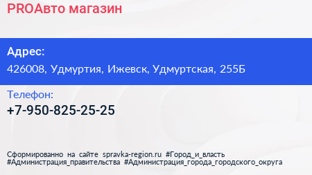 PROАвто, магазин по адресу 426008, Удмуртия, Ижевск, Удмуртская, 255Б в дальнейшем Организация, размещена в следующих категориях: