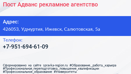 Пост Адванс, рекламное агентство по адресу 426053, Удмуртия, Ижевск, Салютовская, 5а в дальнейшем Организация, размещена в следующих категориях: