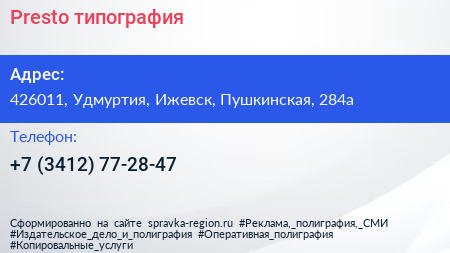 Presto, типография по адресу 426011, Удмуртия, Ижевск, Пушкинская, 284а в дальнейшем Организация, размещена в следующих категориях: