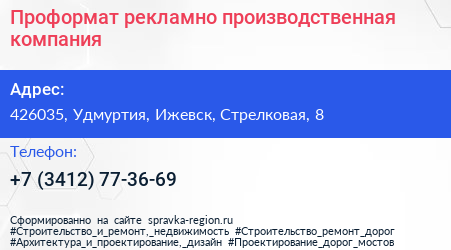 Проформат, рекламно-производственная компания по адресу 426035, Удмуртия, Ижевск, Стрелковая, 8 в дальнейшем Организация, размещена в следующих категориях:
