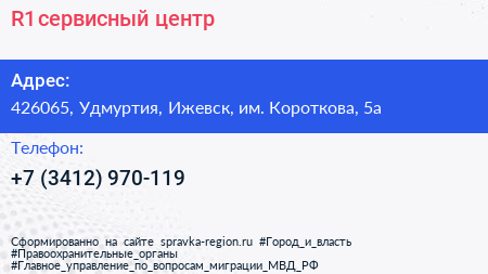 R1, сервисный центр по адресу 426065, Удмуртия, Ижевск, им. Короткова, 5а в дальнейшем Организация, размещена в следующих категориях: