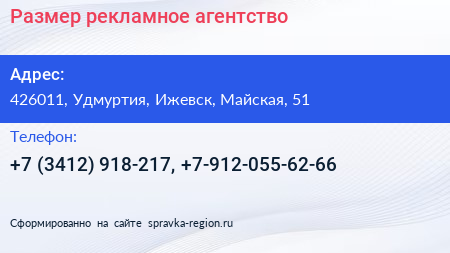 Размер, рекламное агентство по адресу 426011, Удмуртия, Ижевск, Майская, 51 в дальнейшем Организация, размещена в следующих категориях: