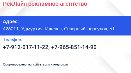 РекЛайн, рекламное агентство по адресу 426011, Удмуртия, Ижевск, Северный переулок, 61 в дальнейшем Организация, размещена в следующих категориях: