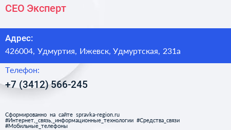 СЕО Эксперт по адресу 426004, Удмуртия, Ижевск, Удмуртская, 231а в дальнейшем Организация, размещена в следующих категориях: