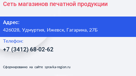 Сеть магазинов печатной продукции по адресу 426028, Удмуртия, Ижевск, Гагарина, 27Б в дальнейшем Организация, размещена в следующих категориях: