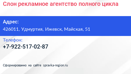Слон, рекламное агентство полного цикла по адресу 426011, Удмуртия, Ижевск, Майская, 51 в дальнейшем Организация, размещена в следующих категориях: