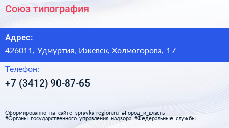 Союз, типография по адресу 426011, Удмуртия, Ижевск, Холмогорова, 17 в дальнейшем Организация, размещена в следующих категориях: