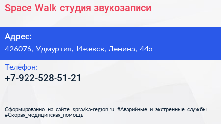 Space Walk, студия звукозаписи по адресу 426076, Удмуртия, Ижевск, Ленина, 44а в дальнейшем Организация, размещена в следующих категориях: