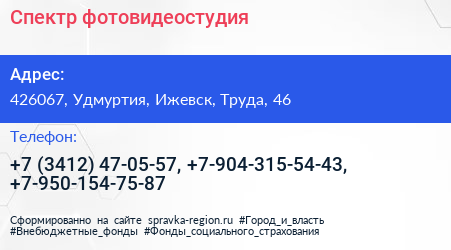 Спектр, фотовидеостудия по адресу 426067, Удмуртия, Ижевск, Труда, 46 в дальнейшем Организация, размещена в следующих категориях: