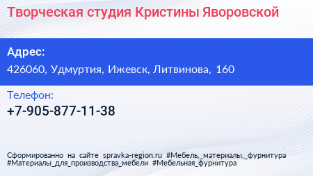 Творческая студия Кристины Яворовской по адресу 426060, Удмуртия, Ижевск, Литвинова, 160 в дальнейшем Организация, размещена в следующих категориях: