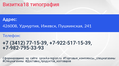 Визитка18, типография по адресу 426008, Удмуртия, Ижевск, Пушкинская, 241 в дальнейшем Организация, размещена в следующих категориях: