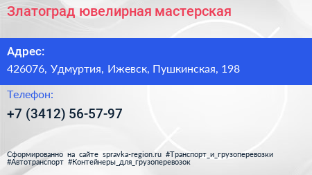 Златоград, ювелирная мастерская по адресу 426076, Удмуртия, Ижевск, Пушкинская, 198 в дальнейшем Организация, размещена в следующих категориях: