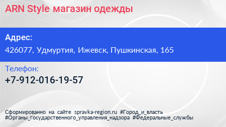 ARN Style, магазин одежды по адресу 426077, Удмуртия, Ижевск, Пушкинская, 165 в дальнейшем Организация, размещена в следующих категориях: