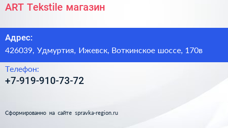 ART Tekstile, магазин по адресу 426039, Удмуртия, Ижевск, Воткинское шоссе, 170в в дальнейшем Организация, размещена в следующих категориях: