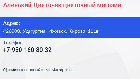 Аленький Цветочек, цветочный магазин по адресу 426008, Удмуртия, Ижевск, Кирова, 111в в дальнейшем Организация, размещена в следующих категориях:
