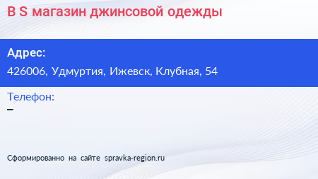 B & S, магазин джинсовой одежды по адресу 426006, Удмуртия, Ижевск, Клубная, 54 в дальнейшем Организация, размещена в следующих категориях: