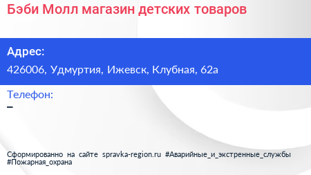 Бэби Молл, магазин детских товаров по адресу 426006, Удмуртия, Ижевск, Клубная, 62а в дальнейшем Организация, размещена в следующих категориях: