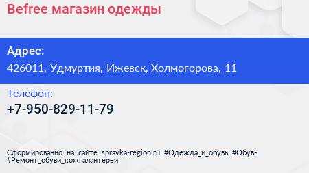 Befree, магазин одежды по адресу 426011, Удмуртия, Ижевск, Холмогорова, 11 в дальнейшем Организация, размещена в следующих категориях: