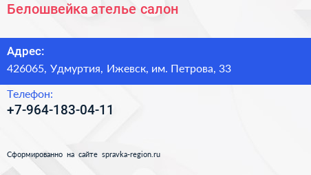 Белошвейка, ателье-салон по адресу 426065, Удмуртия, Ижевск, им. Петрова, 33 в дальнейшем Организация, размещена в следующих категориях: