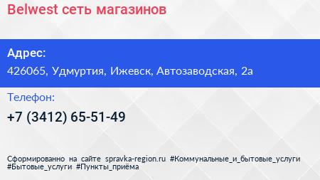 Belwest, сеть магазинов по адресу 426065, Удмуртия, Ижевск, Автозаводская, 2а в дальнейшем Организация, размещена в следующих категориях: