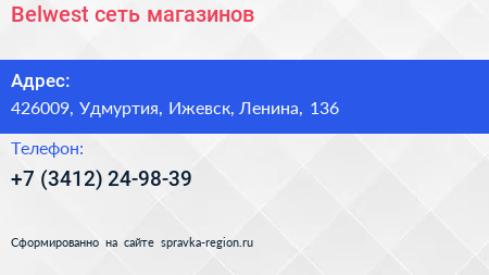 Belwest, сеть магазинов по адресу 426009, Удмуртия, Ижевск, Ленина, 136 в дальнейшем Организация, размещена в следующих категориях: