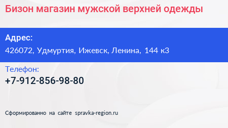 Бизон, магазин мужской верхней одежды по адресу 426072, Удмуртия, Ижевск, Ленина, 144 к3 в дальнейшем Организация, размещена в следующих категориях: