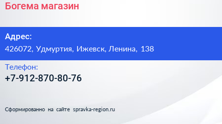 Богема, магазин по адресу 426072, Удмуртия, Ижевск, Ленина, 138 в дальнейшем Организация, размещена в следующих категориях: