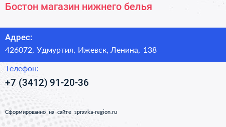 Бостон, магазин нижнего белья по адресу 426072, Удмуртия, Ижевск, Ленина, 138 в дальнейшем Организация, размещена в следующих категориях: