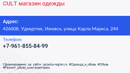 CULT, магазин одежды по адресу 426008, Удмуртия, Ижевск, улица Карла Маркса, 244 в дальнейшем Организация, размещена в следующих категориях: