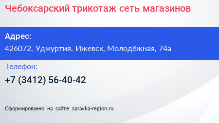 Чебоксарский трикотаж, сеть магазинов по адресу 426072, Удмуртия, Ижевск, Молодёжная, 74а в дальнейшем Организация, размещена в следующих категориях: