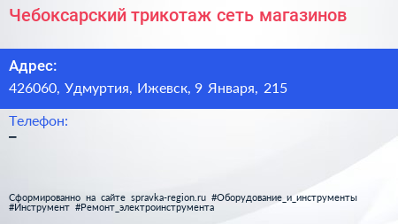 Чебоксарский трикотаж, сеть магазинов по адресу 426060, Удмуртия, Ижевск, 9 Января, 215 в дальнейшем Организация, размещена в следующих категориях: