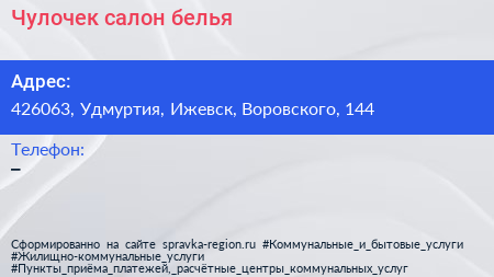 Чулочек, салон белья по адресу 426063, Удмуртия, Ижевск, Воровского, 144 в дальнейшем Организация, размещена в следующих категориях: