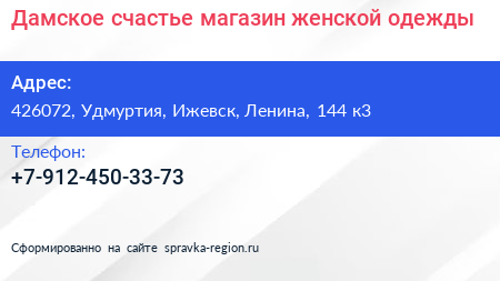 Дамское счастье, магазин женской одежды по адресу 426072, Удмуртия, Ижевск, Ленина, 144 к3 в дальнейшем Организация, размещена в следующих категориях: