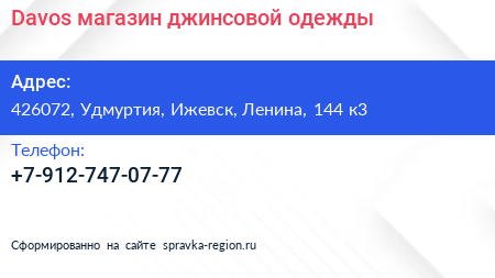 Davos, магазин джинсовой одежды по адресу 426072, Удмуртия, Ижевск, Ленина, 144 к3 в дальнейшем Организация, размещена в следующих категориях: