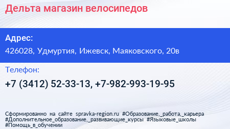 Дельта, магазин велосипедов по адресу 426028, Удмуртия, Ижевск, Маяковского, 20в в дальнейшем Организация, размещена в следующих категориях: