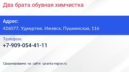 Два брата, обувная химчистка по адресу 426077, Удмуртия, Ижевск, Пушкинская, 116 в дальнейшем Организация, размещена в следующих категориях: