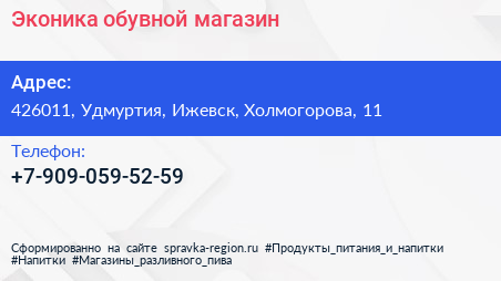Эконика, обувной магазин по адресу 426011, Удмуртия, Ижевск, Холмогорова, 11 в дальнейшем Организация, размещена в следующих категориях: