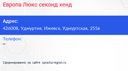 Европа Люкс, секонд-хенд по адресу 426008, Удмуртия, Ижевск, Удмуртская, 255в в дальнейшем Организация, размещена в следующих категориях: