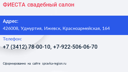 ФИЕСТА, свадебный салон по адресу 426008, Удмуртия, Ижевск, Красноармейская, 164 в дальнейшем Организация, размещена в следующих категориях: