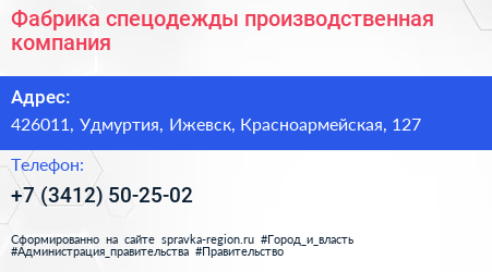 Фабрика спецодежды, производственная компания по адресу 426011, Удмуртия, Ижевск, Красноармейская, 127 в дальнейшем Организация, размещена в следующих категориях: