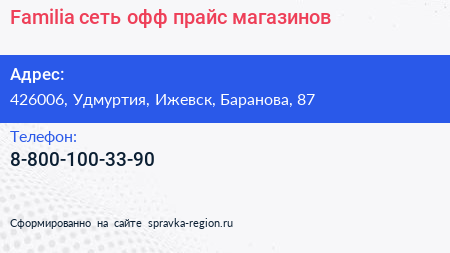 Familia, сеть офф-прайс магазинов по адресу 426006, Удмуртия, Ижевск, Баранова, 87 в дальнейшем Организация, размещена в следующих категориях: