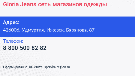 Gloria Jeans, сеть магазинов одежды по адресу 426006, Удмуртия, Ижевск, Баранова, 87 в дальнейшем Организация, размещена в следующих категориях: