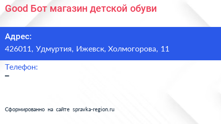 Good Бот, магазин детской обуви по адресу 426011, Удмуртия, Ижевск, Холмогорова, 11 в дальнейшем Организация, размещена в следующих категориях: