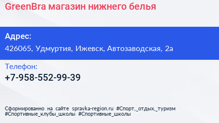 GreenBra, магазин нижнего белья по адресу 426065, Удмуртия, Ижевск, Автозаводская, 2а в дальнейшем Организация, размещена в следующих категориях: