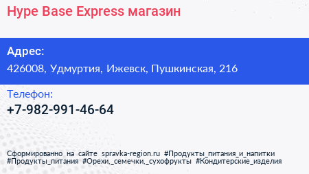 Hype Base Express, магазин по адресу 426008, Удмуртия, Ижевск, Пушкинская, 216 в дальнейшем Организация, размещена в следующих категориях: